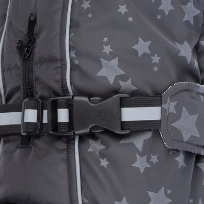 El abrigo para perros Reflecting Stars tiene características muy funcionales. Está fabricado con material hidrófugo , tiene un forro interior termorreflectante y para una mayor protección tiene puños en las patas y cuello alto. Está equipado con elementos reflectantes.
