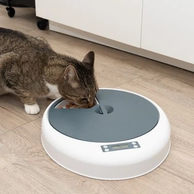 Comedero automático para gatos y perros pequeños, a pilas, hasta 5 comidas al día programables, intervalos ajustables en horas y miutosn, fácil cuidado, color: blanco / gris