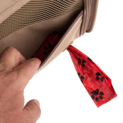 Este bolso dispone de una correa de hombro acolchada de longitud regulable. Además, es un accesorio muy práctico porque es compatible con trolleys. Gracias a una solapa para equipajes, se fija a una maleta de viaje con ruedas. Sus 2 bolsillos laterales, uno de ellos con dispensador de bolsitas higiénicas, son idóneos para guardar pequeños objetos. También tiene una correa corta integrada con mosquetón para prevenir que tu mascota salte fuera de la bolsa. Cuando no utilices la bolsa, puedes plegarla para ahorrar espacio.