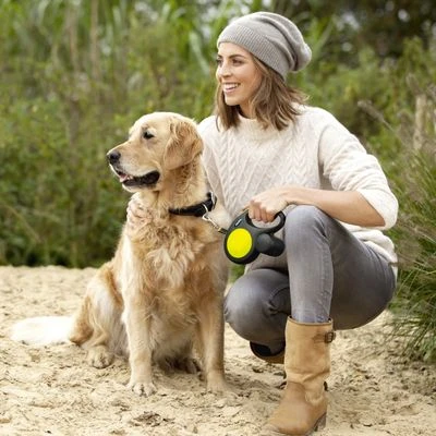 La correa flexi New Neon os dará mayor visibilidad, gracias a sus dos pegatinas reflectantes y a sus elementos de llamativo color amarillo neón. Así, incluso en los días de mal tiempo o de noche, los peatones y los conductores os verán mejor.