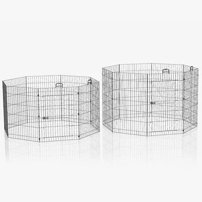 Parque plegable de acero con 8 piezas individuales que se pueden montar según necesidad. Para animales pequeños. Con puerta integrada y asas de plástico extraíbles. Color negro.