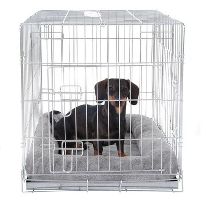 Jaula de metal para perros. Con dos puertas para facilitar la entrada y la salida. Incluye un cojín apropiado. Se puede plegar para ahorrar espacio.